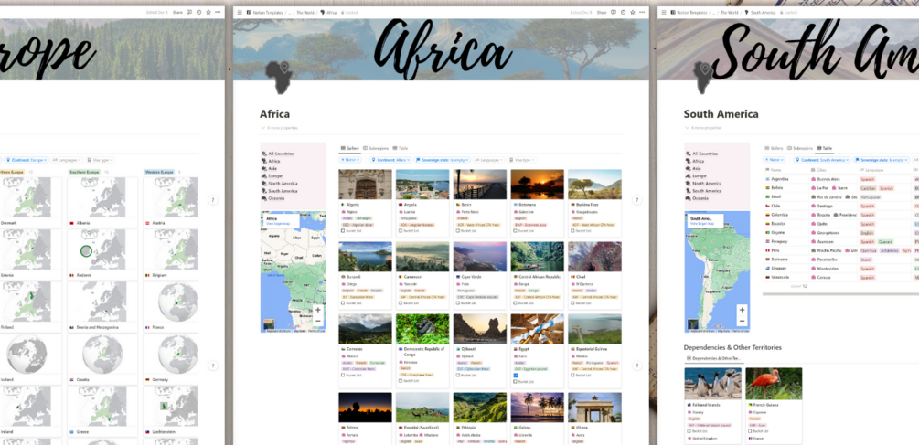 • All countries have icons, cover images, official currency, official language, and sub-region in continent.